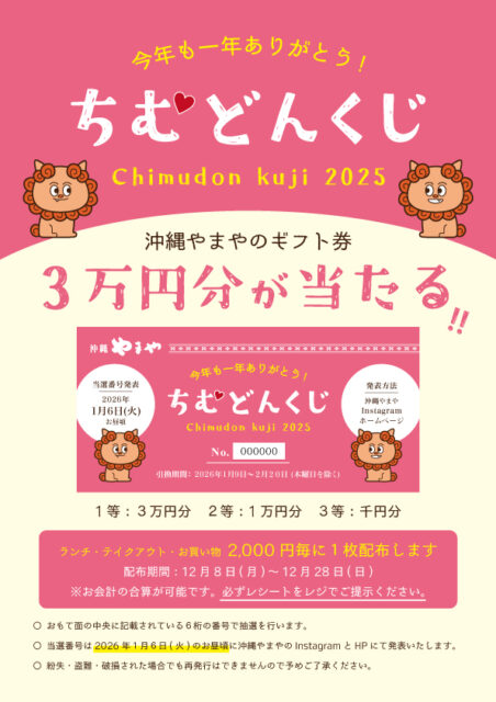 ただいま店舗では年末限定ラッキーチャンス『ちむどんくじ』の配布をおこなっています。